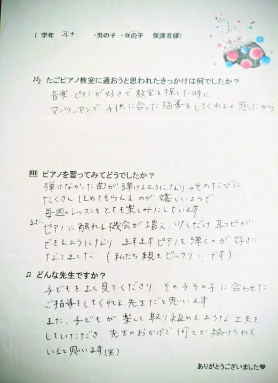たごピアノ教室(四日市市)にお通いの生徒さまの声をご紹介します。